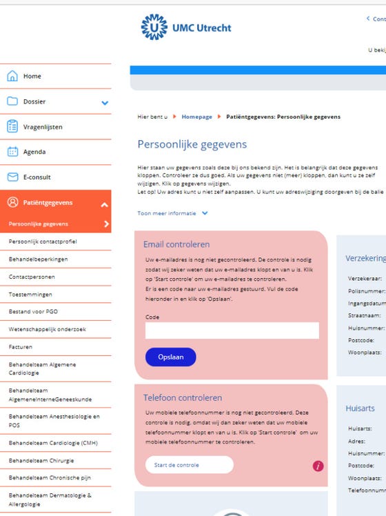 De patiënt voert de controlecode in, slaat deze op en ziet dat de gegevens zijn aangepast.